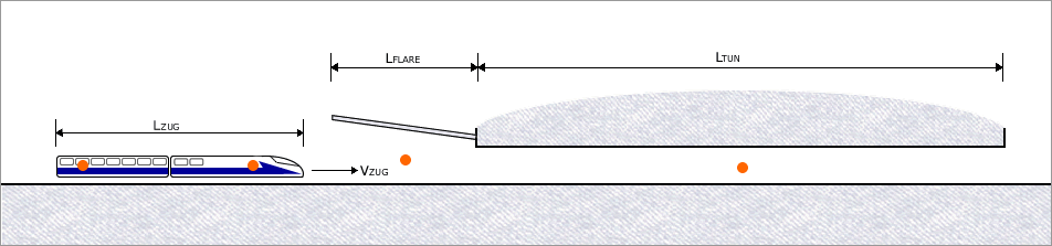 The area of the end of the flare must be at least as great as the area of the tunnel and must not exceed the area of the flare portal. The full version of ThermoTun allows experienced users to choose any area greater than zero. ThermoTun-Online is intended only for conventional train:tunnel applications.